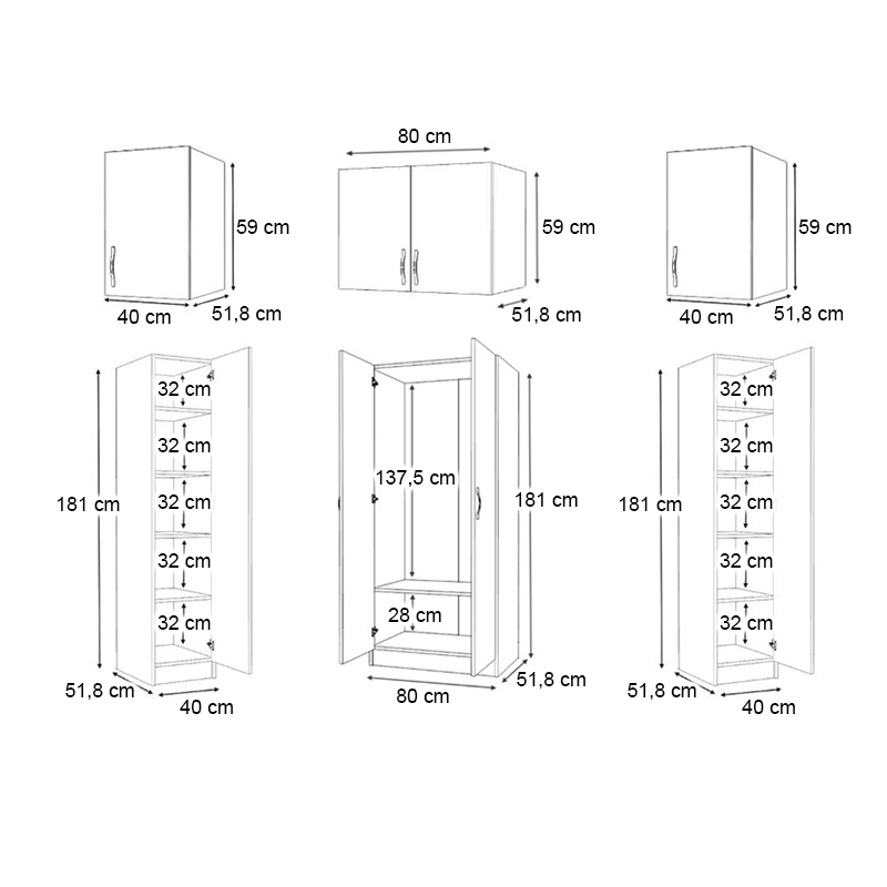 • Διαστάσεις δίφυλλης ντουλάπας: Μήκος 80 x Βάθος 51,8 x Ύψος 181 εκ.